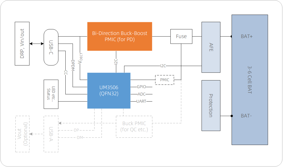 UM3506實(shí)現(xiàn)PD DRP協(xié)議,電源管理,BMS,并與電動(dòng)工具通信,確保充放安全